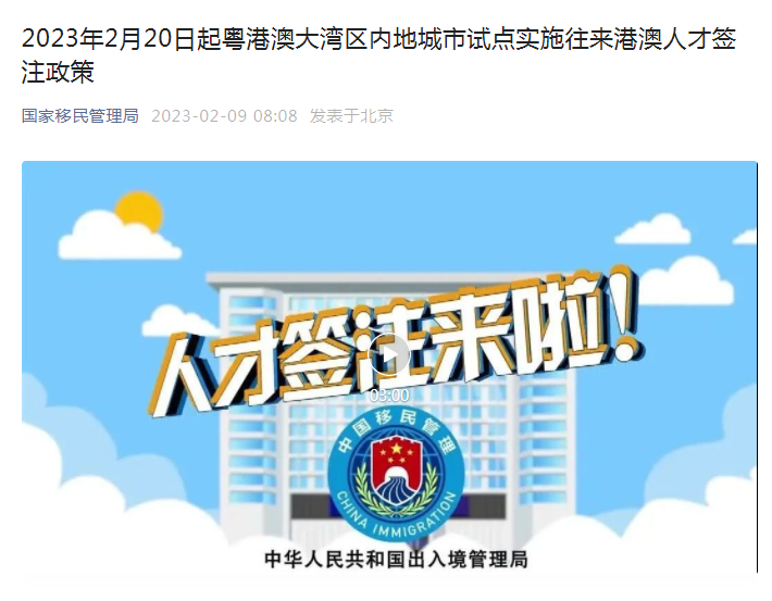 据国家移民管理局官方微信号2月9日消息,中华人民共和国出入境管理局2月9日发布公告,为便利粤港澳大湾区人才从事科研学术交流活动,促进服务粤港澳大湾区建设发展,自2023年2月20日起在粤港澳大湾区内地城市试点实施往来港澳人才签注政策。