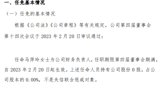 挖贝网2月21日,电科电源(831373)发公告称,根据《公司法》《公司章程》等有关规定,公司第四届董事会第十四次会议于2023年2月20日审议通过:任命马萍玲为公司财务负责人,任职期限第四届董事会期满,自2023年2月20日起生效。