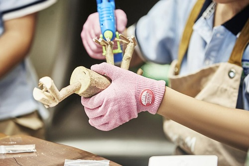 在广受关注的烹饪实践中,受以往经验和传统观念的影响,常有家长表示不愿意真正放手让孩子“动刀”,“怕受伤”、“怕麻烦”是家长主要的反馈。尤其是低学龄的孩子难以操作刀具,锋利的刀口一不小心就会落到手指上。为此,嘉得利研发了针对于解决孩子防切手问题的功能手套,使用“黑科技”防割面料,能提供各种切割等级的防护。在嘉得利开设的研学课堂可以看到,一群5、6岁小朋友戴上糖果色的防切割手套,聚精会神地把萝卜和青椒切成块状,俨然一副“烹饪小达人”模样。